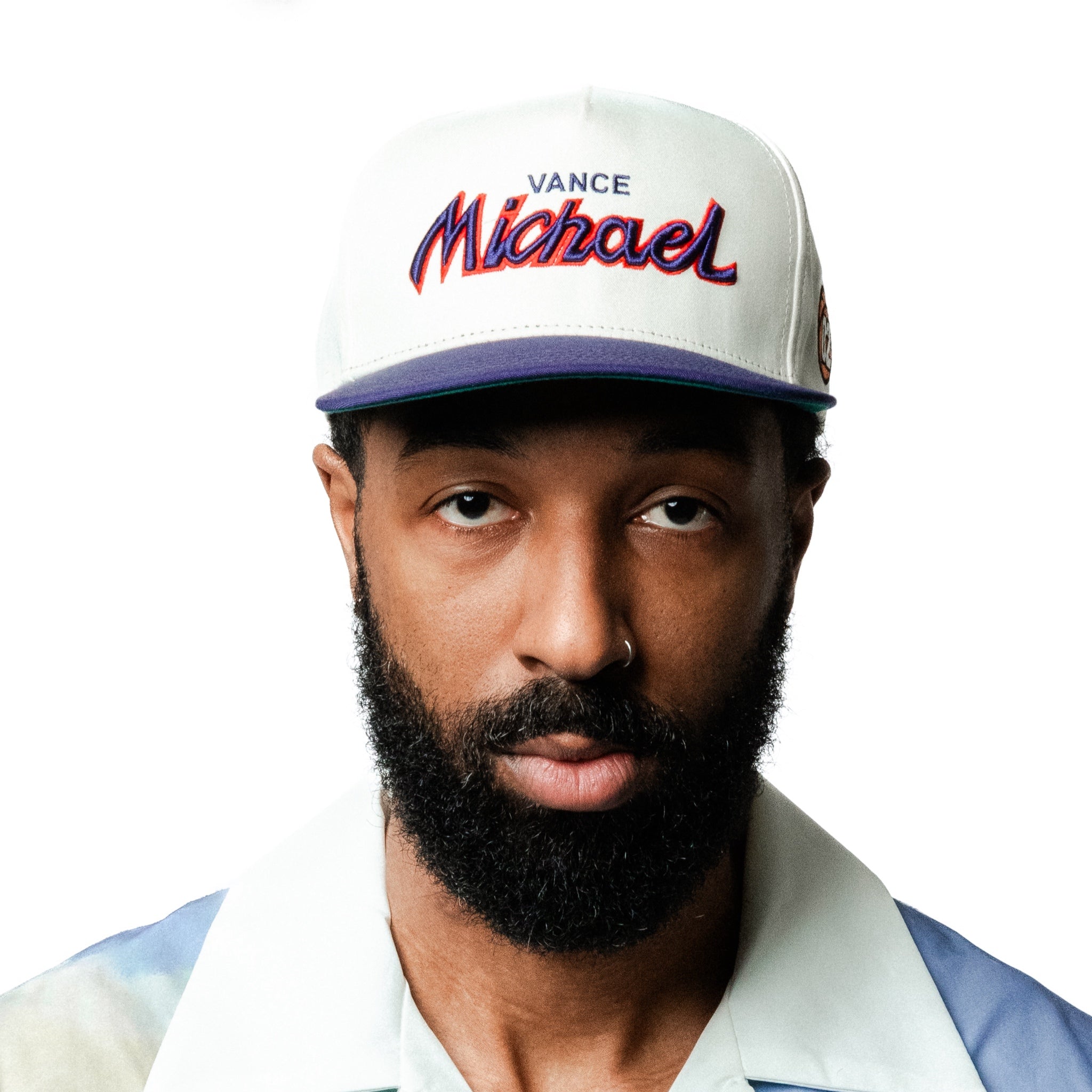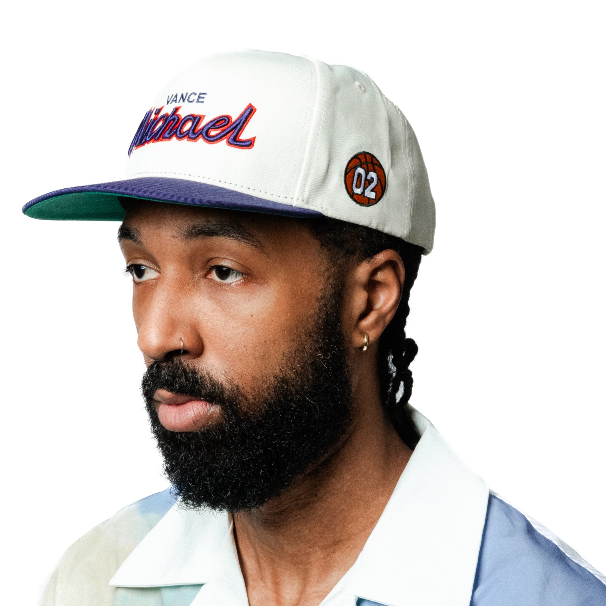 Heavyweight structured hat with "Vance Michael" designs embroidered on the front and side panel. Green under brim. Adjustable snapback fastening at back. Vance Michael branding throughout inside of cap.