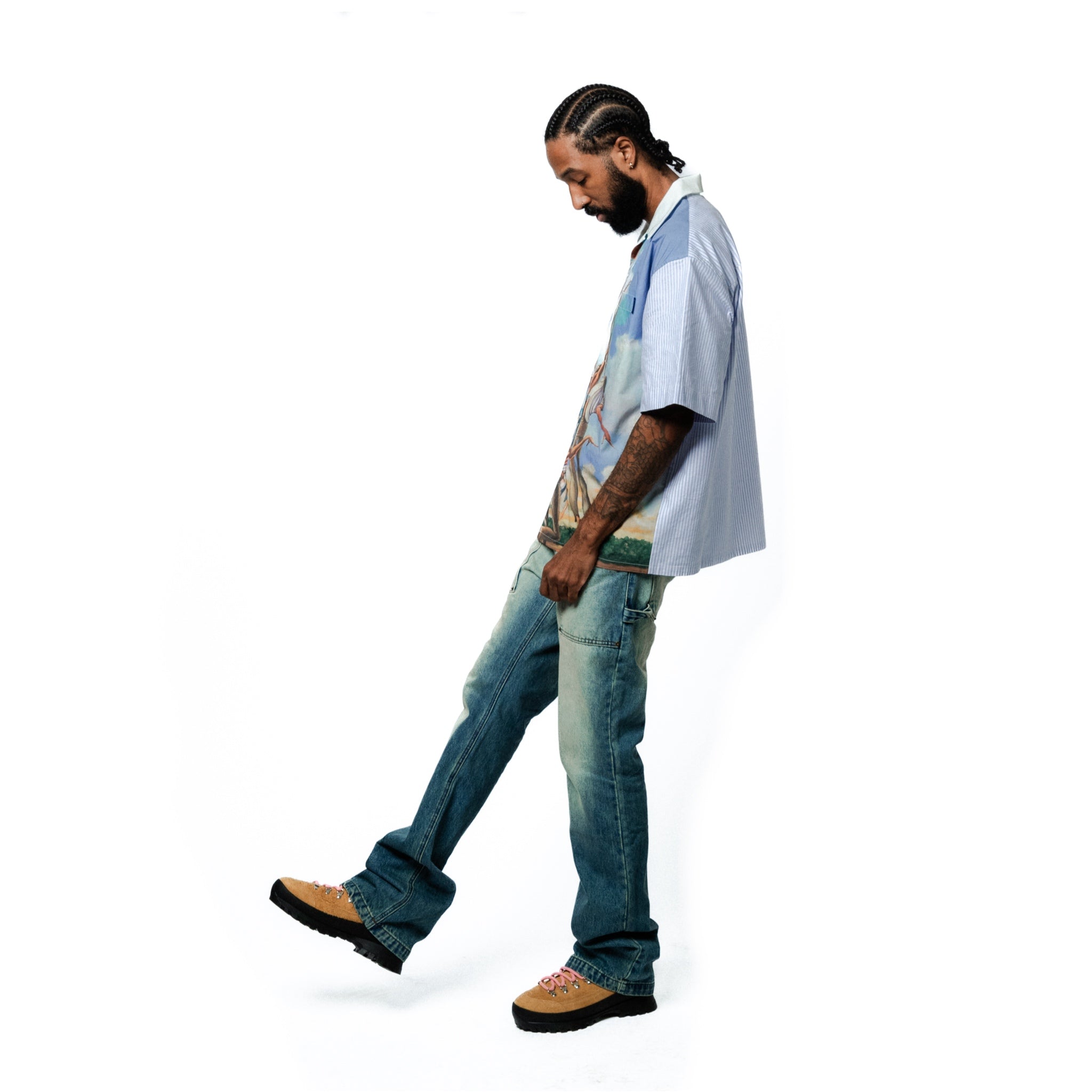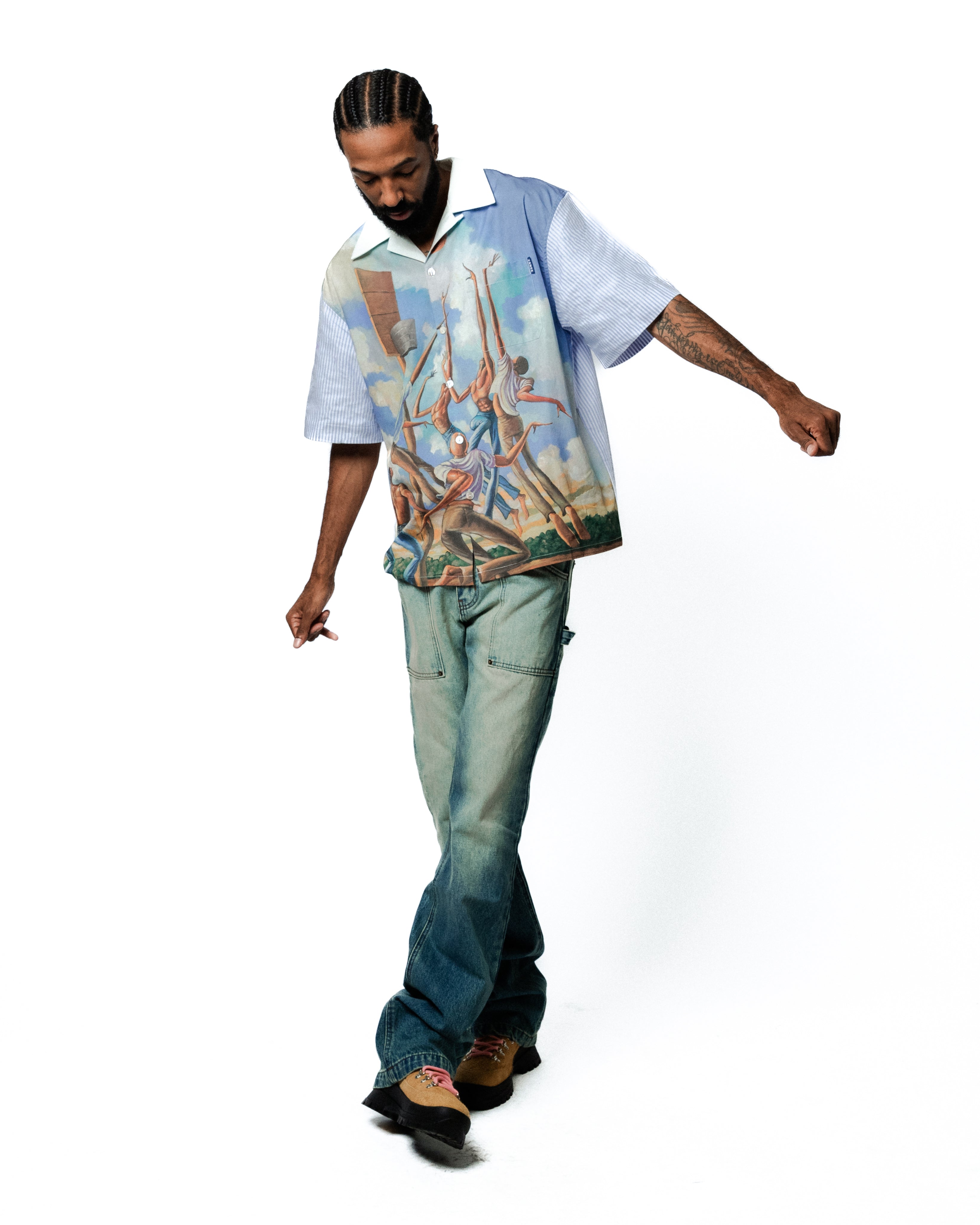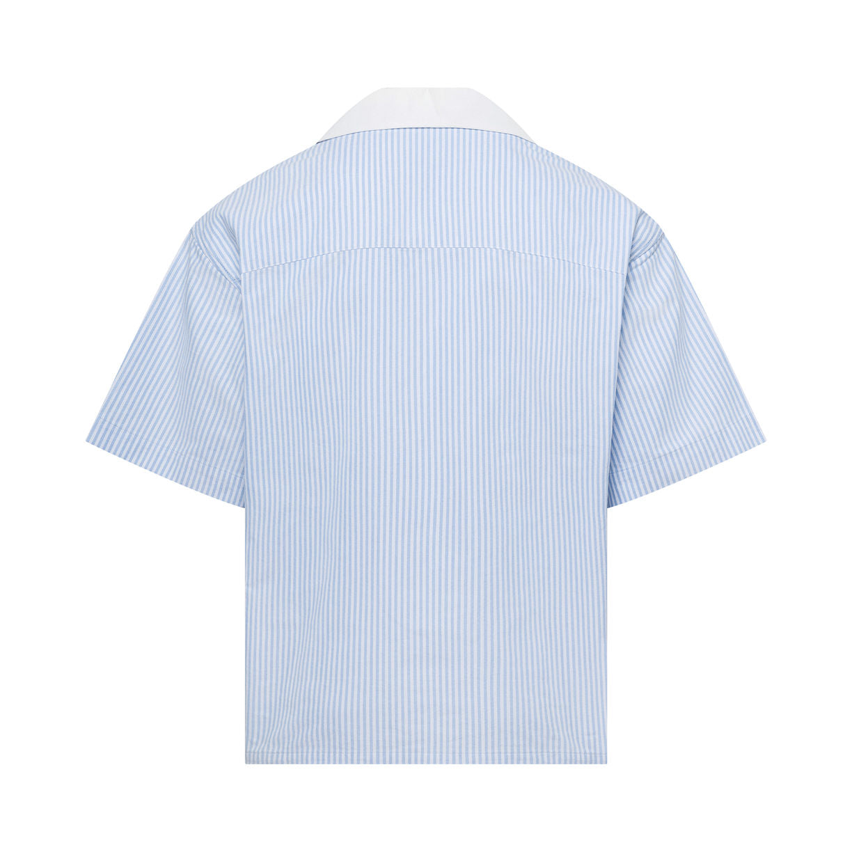 Cotton poplin button shirt with graphic printed on front and stripped pattern at back and on sleeves. Shirt has a front pocket with branded label at chest. This shirt is sewn with our signature cut that has a slightly oversized boxy fit.